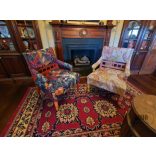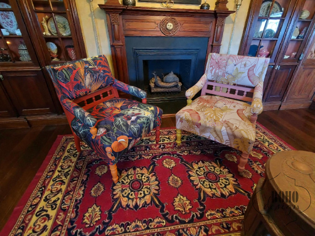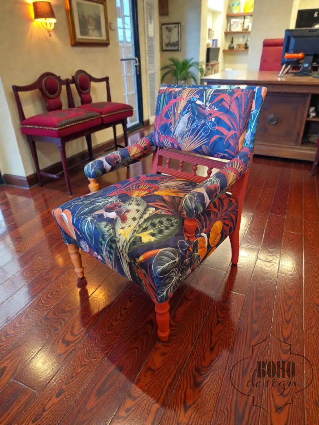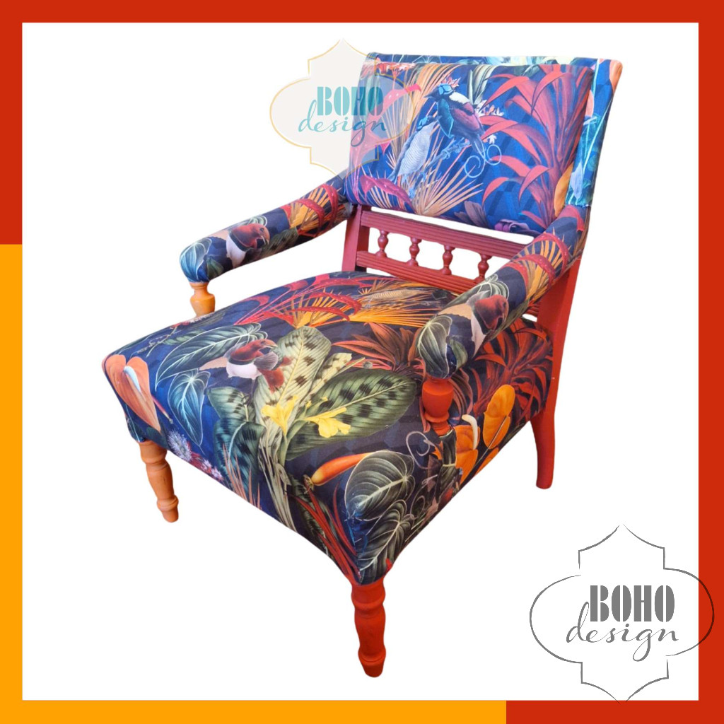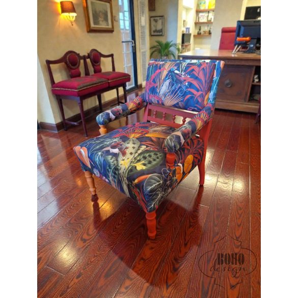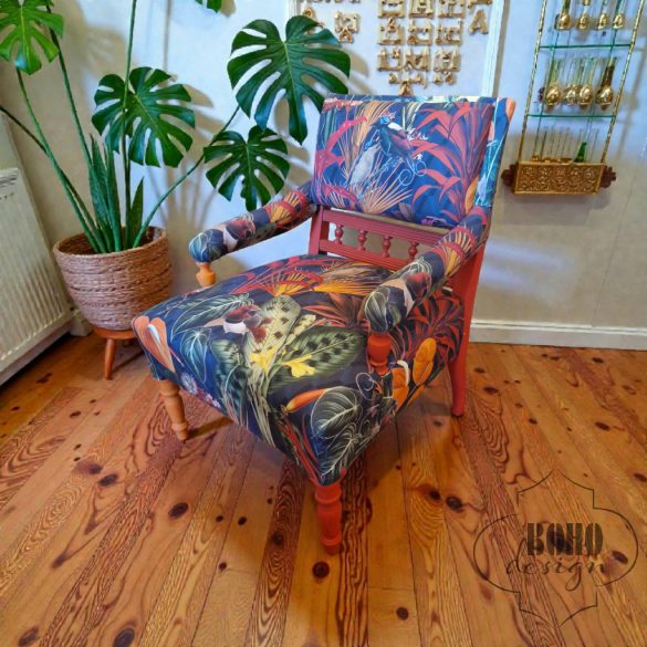 Trópusi mintás bohém fotel, Piros-narancs - szakszerűen felújított antik