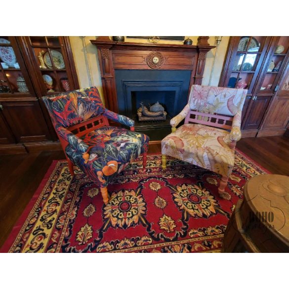 Kárpitja új, friss és élénk; kárpitos szakember által felújított. A fa részeket kézműves bútorfestő újította fel, hogy igazán egyedi, vibráló darab szülessen.